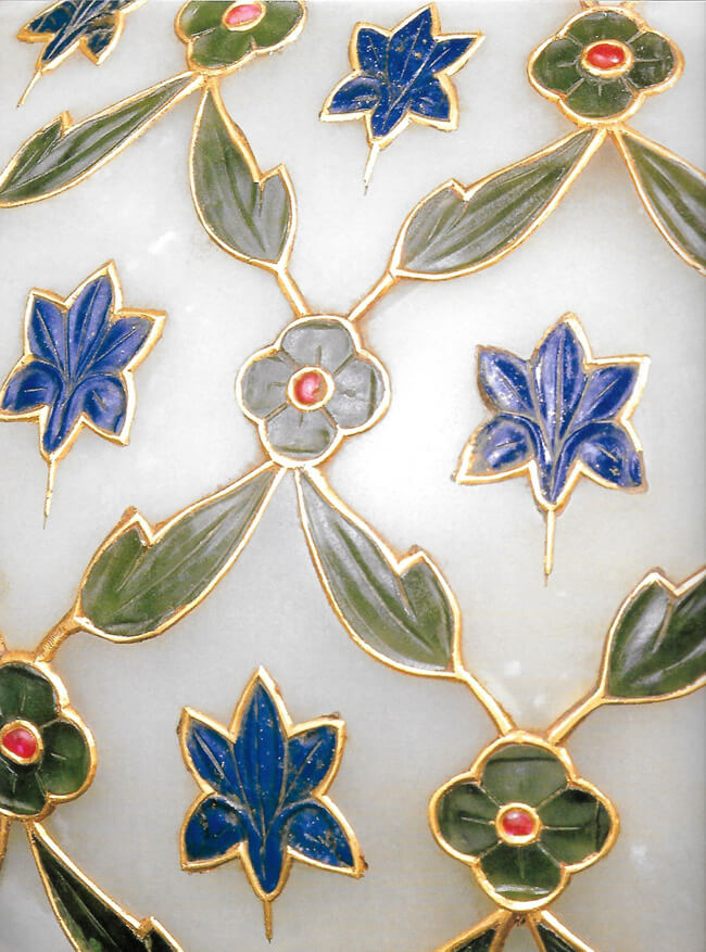 Photo above:- Detail of huqqa bowl. White jade base inlaid with green jade, lapis lazuli and gold. Mughal India, early 18th century.
