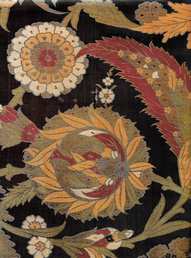 Photo above:- ‘Kemha’ (brocaded silk) detail of a Kaftan in ‘saz’ style. Ottoman Turkey, c.1550 CE. Source:- Republic of Turkey Ministry of Culture.