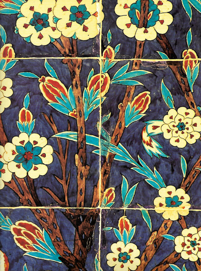 Photo above:- Iznik tiles from the Mosque of Rustem Pasha, Istanbul, 1561 CE. Source:- ‘The Art of Ottoman Ceramics’ by Walter B. Denny.