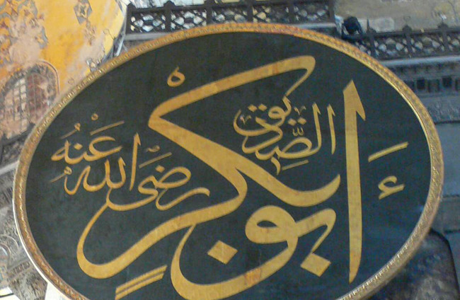 Calligraphy saying 'Abu Bakr', may God be pleased with him.